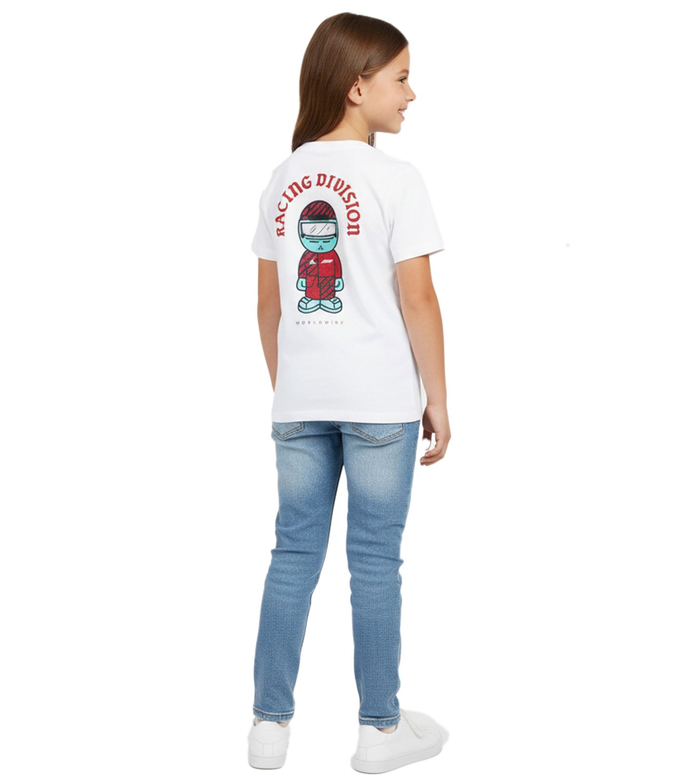 Il arbore le logo F1® sur la poitrine et un imprimé dessin animé amusant représentant un pilote de la Racing Division Worldwide au dos.