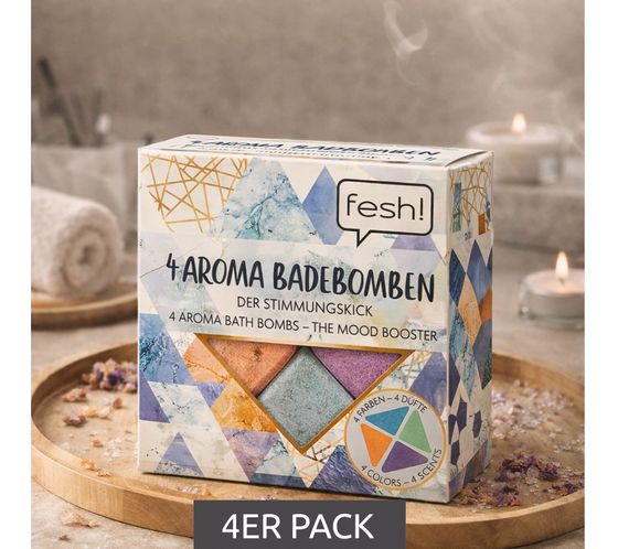 Confezione da 4 bombe da bagno aromatiche fesh! in quattro diversi colori e profumazioni - Accessori da bagno sostenibili - Benessere Blu/Viola/Arancione/Giallo