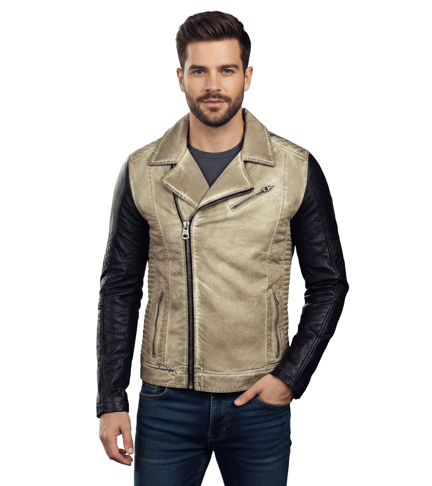 Giacca da motociclista casual da uomo, modello lavato con maniche in similpelle, giacca di transizione slim fit 8837 Beige