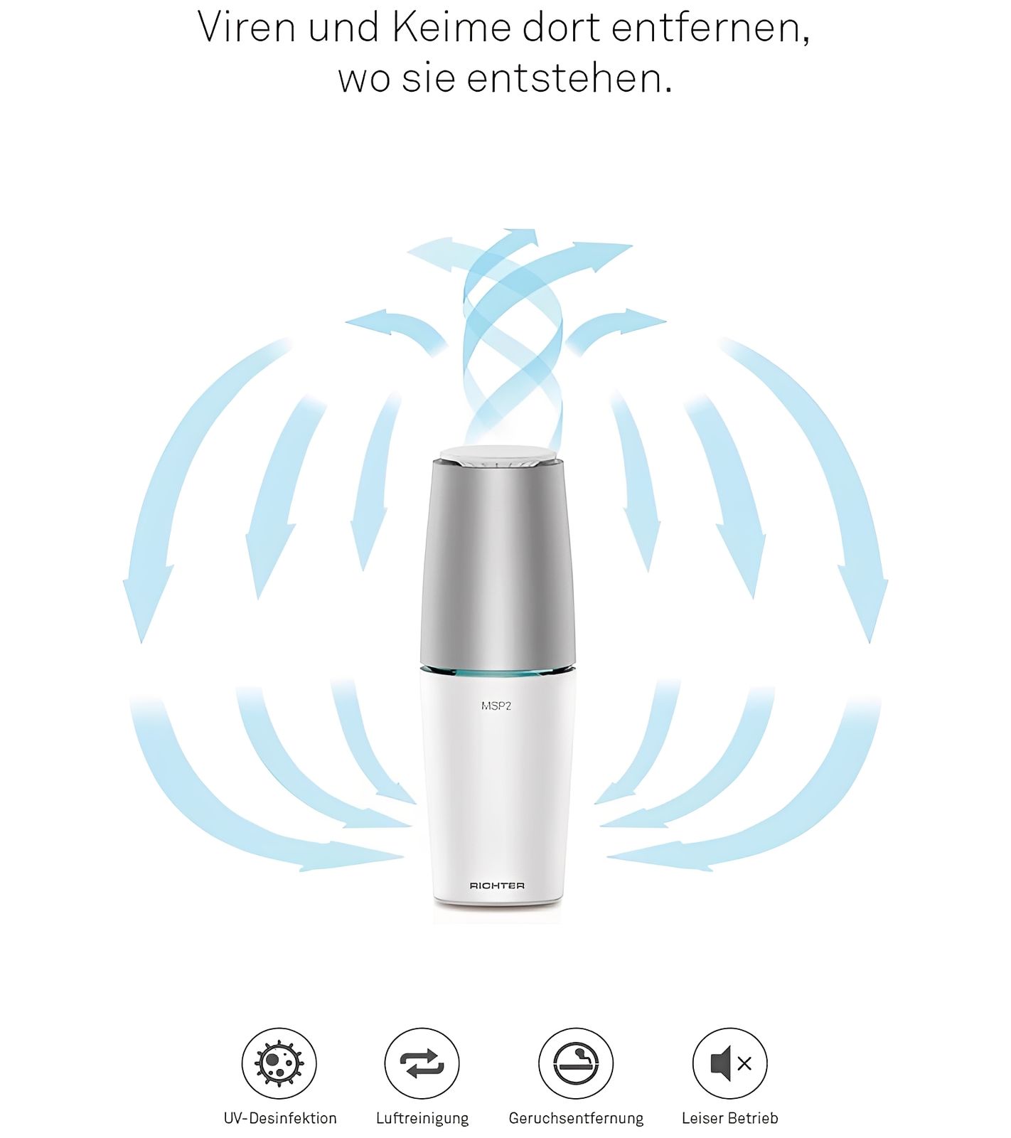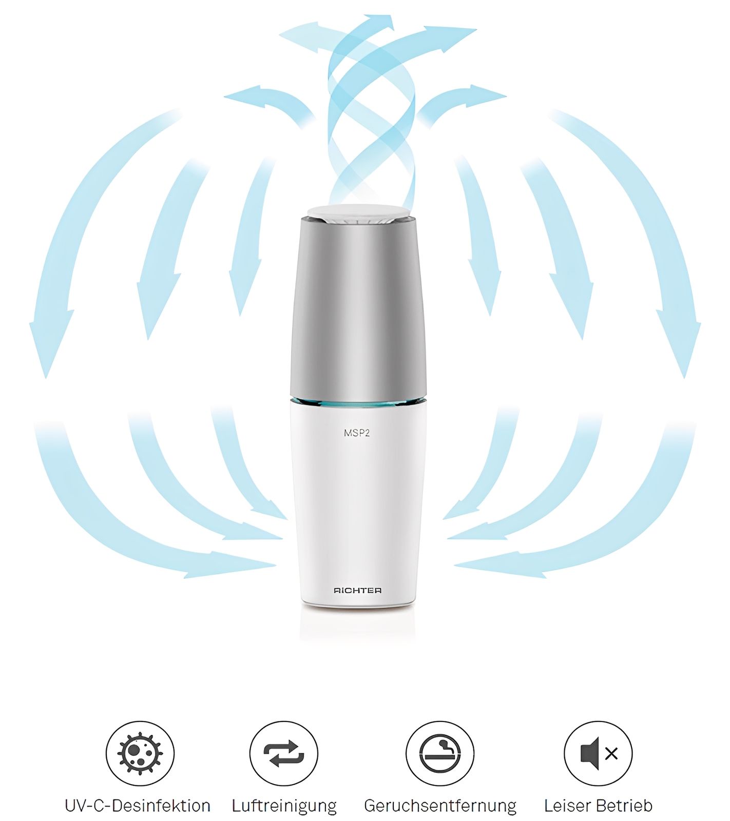 Purificatore d'aria UV Richter, sterilizzatore d'aria, disinfezione UV, purificazione dell'aria, rimozione degli odori, MSP bianco/argento, portatile con connessione USB o fisso con connessione alla rete elettrica