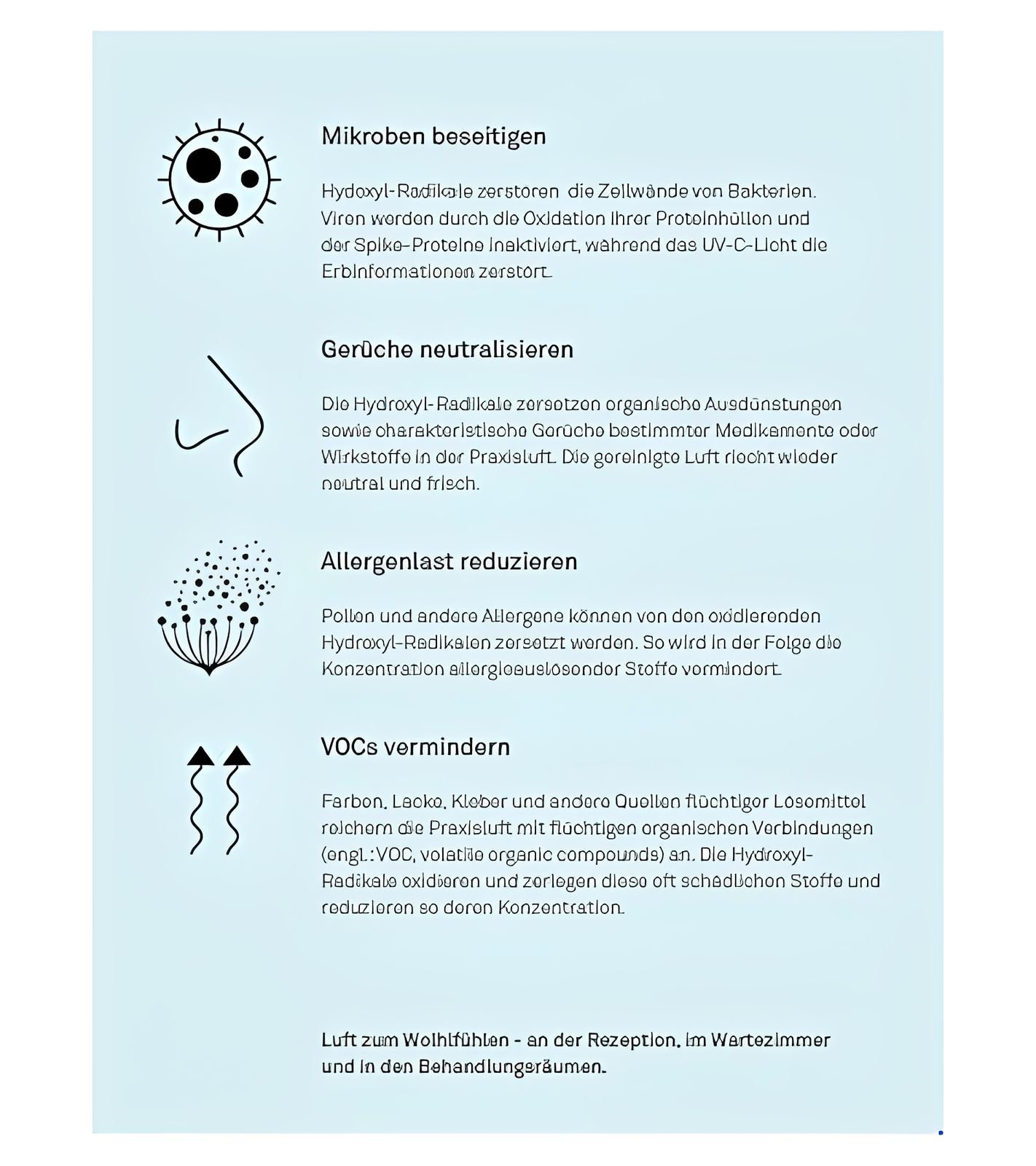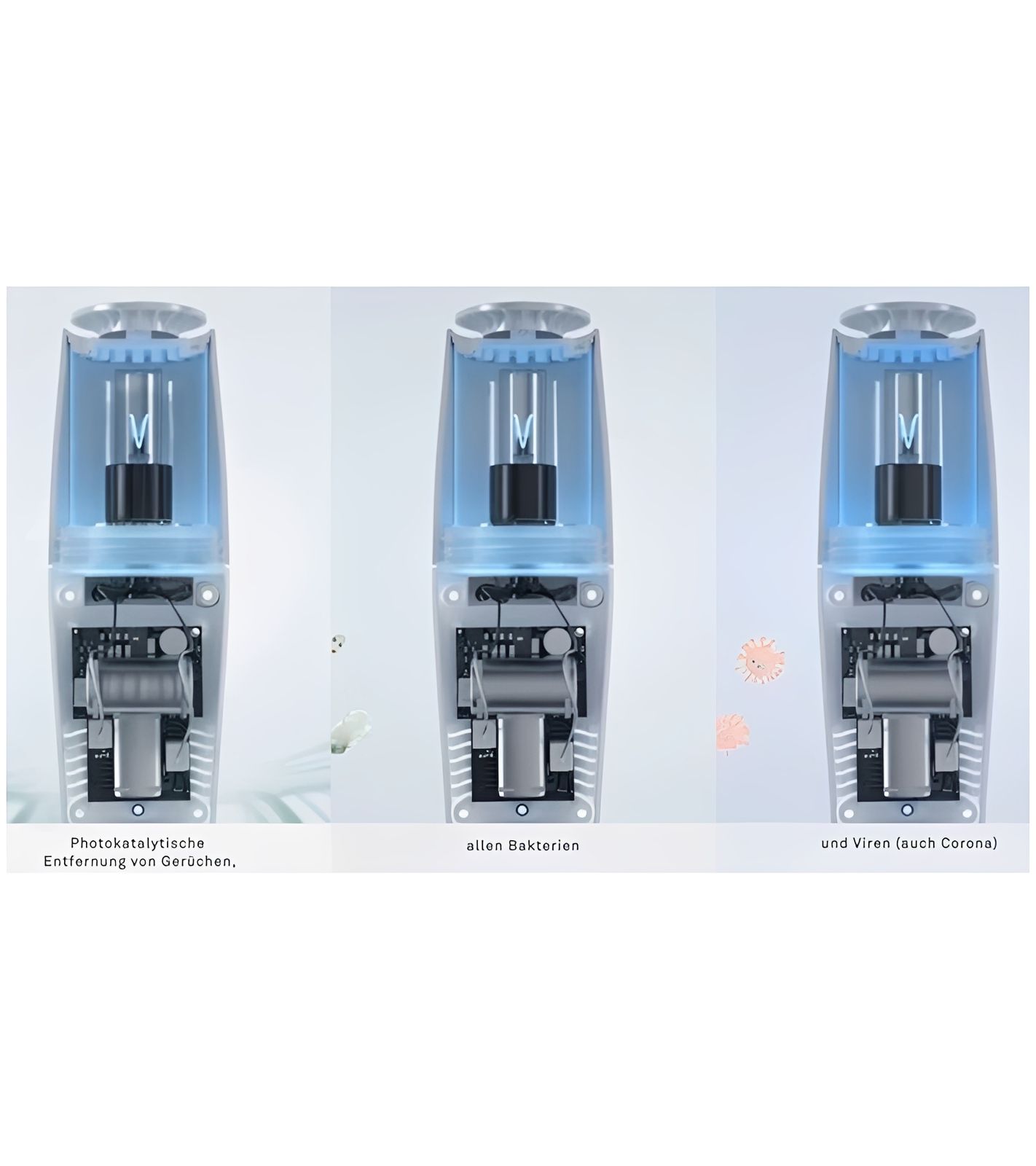 Pulisce in modo affidabile l'area circostante (10 m²) (in 2 ore). Batteri, virus, pollini e odori vengono neutralizzati.