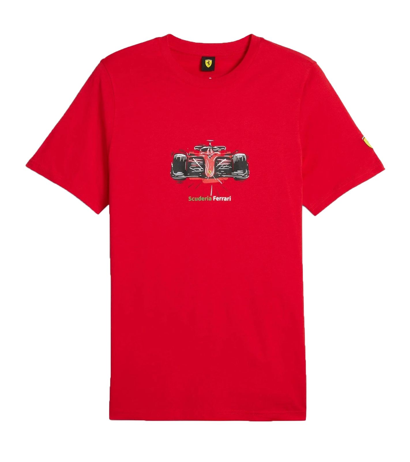 Questa T-shirt da uomo presenta un accattivante logo Scuderia Ferrari e un design di un'auto da corsa sul davanti.