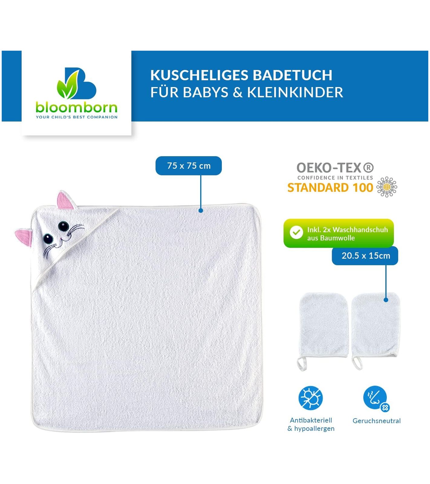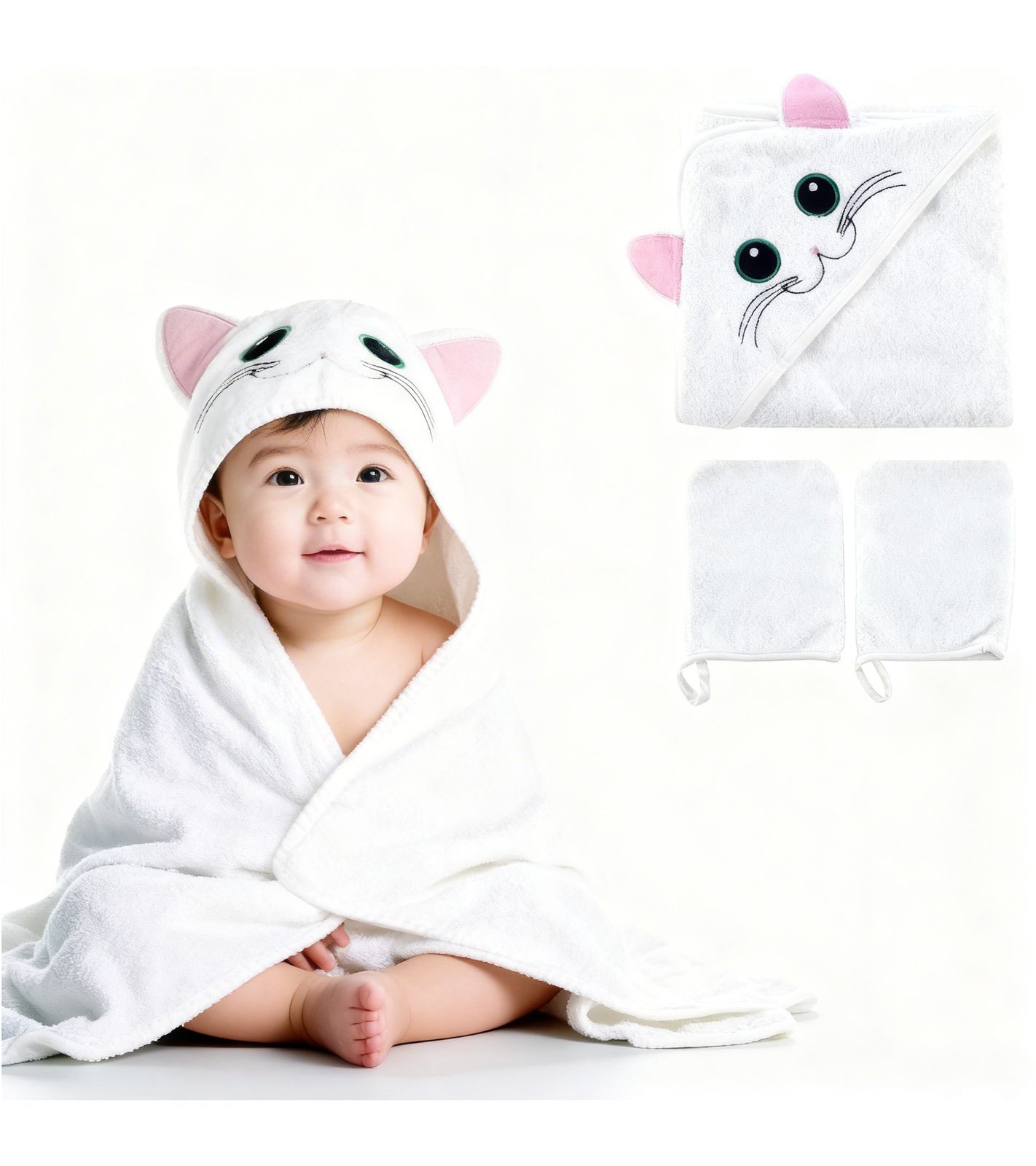 Kuschelweiches bloomborn Baby Badetücher Set Kapuzen-Handtuch mit Katzenmotiv inkl. 2x Waschhandschuh Baumwoll-Badetuch 75 x 75cm Weiß