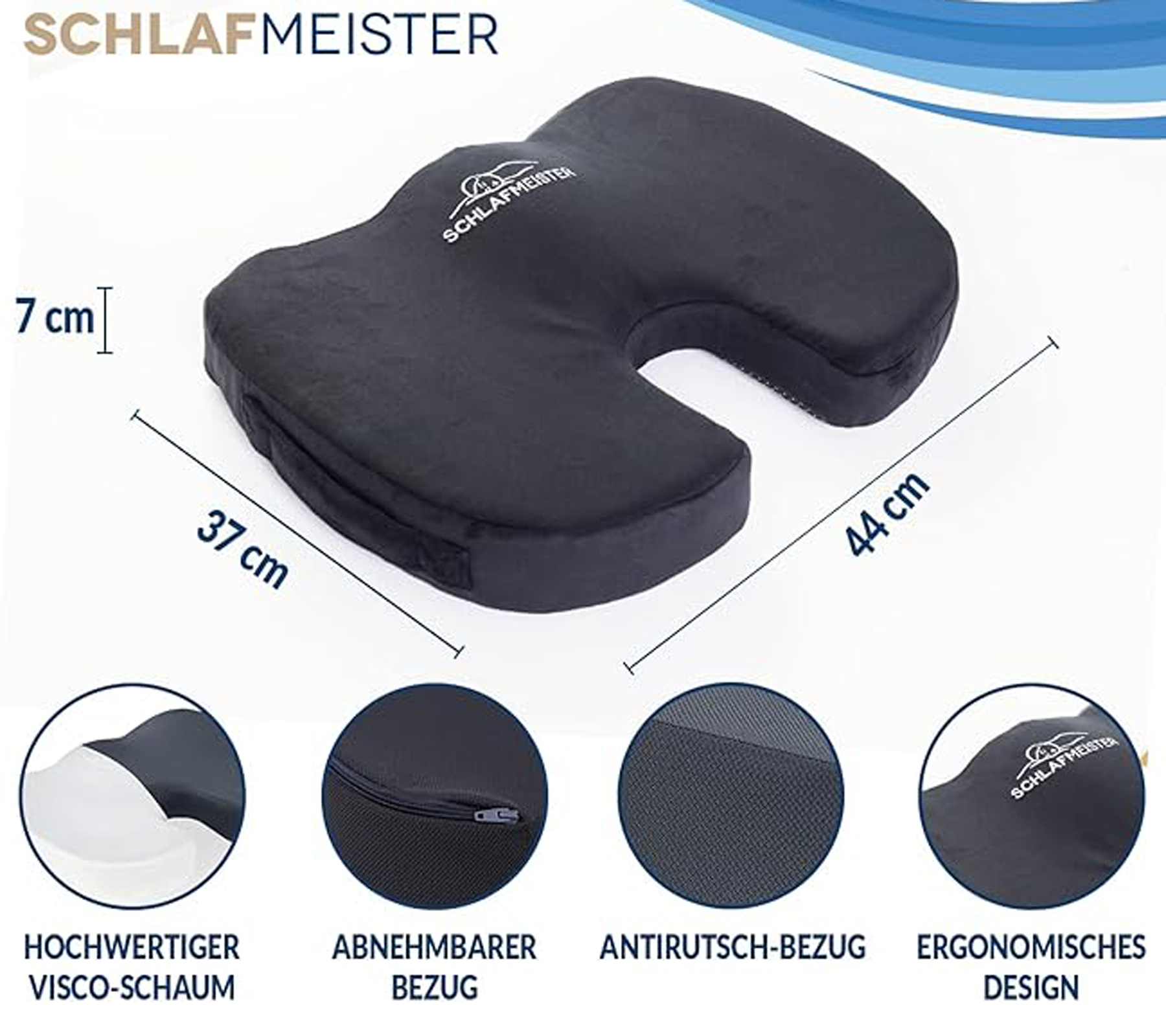 orthopädisches SCHLAFMEISTER Badger Sitz-Kissen OEKO-TEX zertifiziert Steißbein-Kissen 44x37x7cm Schwarz