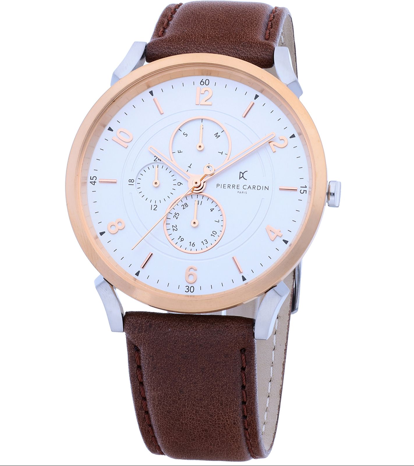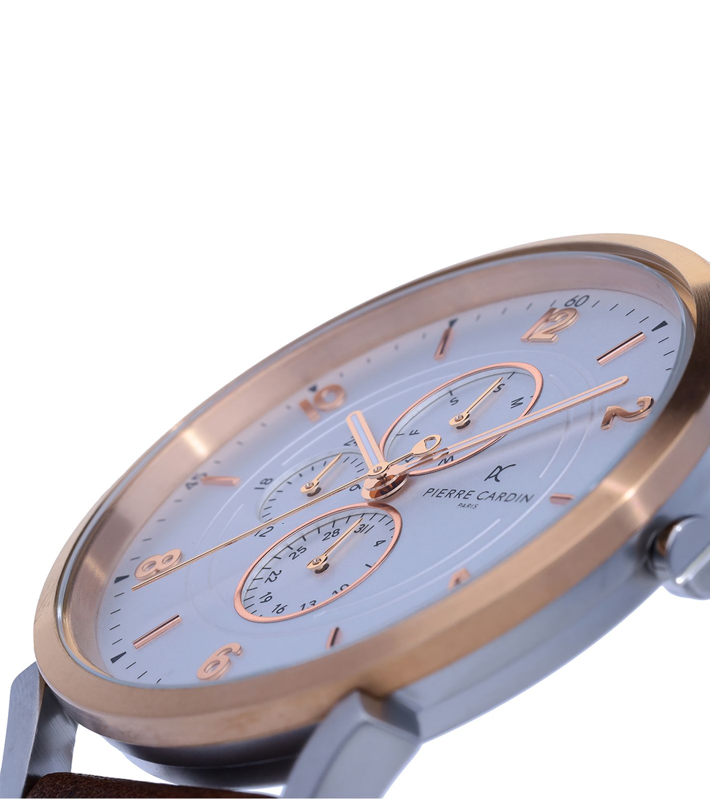 Pierre Cardin Herren Armband-Uhr mit Multi-Ziffernblatt analoge Quarz-Uhr 3ATM 44mm mit Leder-Armband in Braun/Rosegold/Silber oder mit Textil-Armband in Schwarz/Kupfer