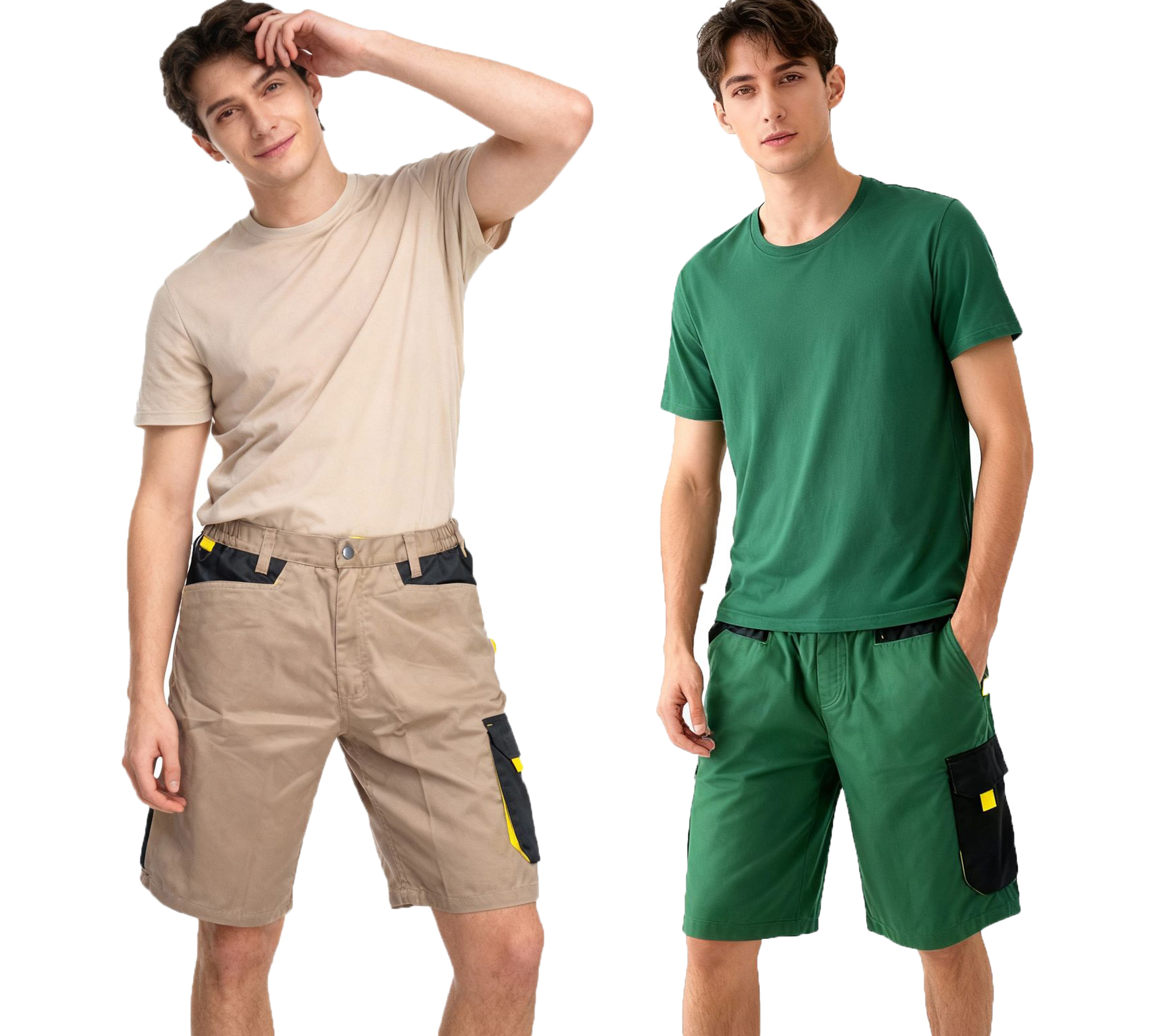 PUREWORK Herren Arbeits-Shorts mit 6 Taschen Cargo-Bermuda nachhaltige Arbeits-Hose Grün/Schwarz/Gelb oder Beige/Schwarz/Gelb