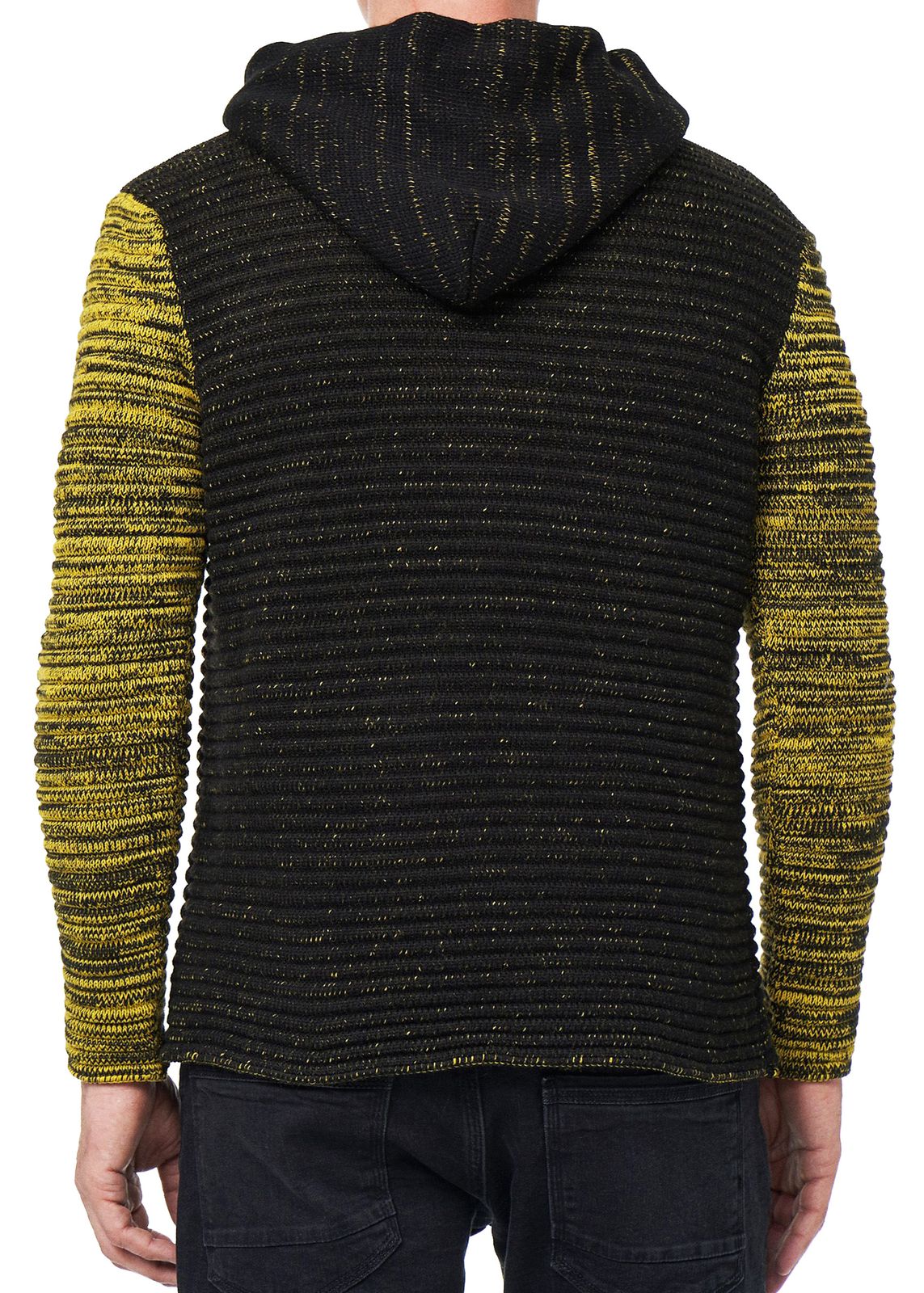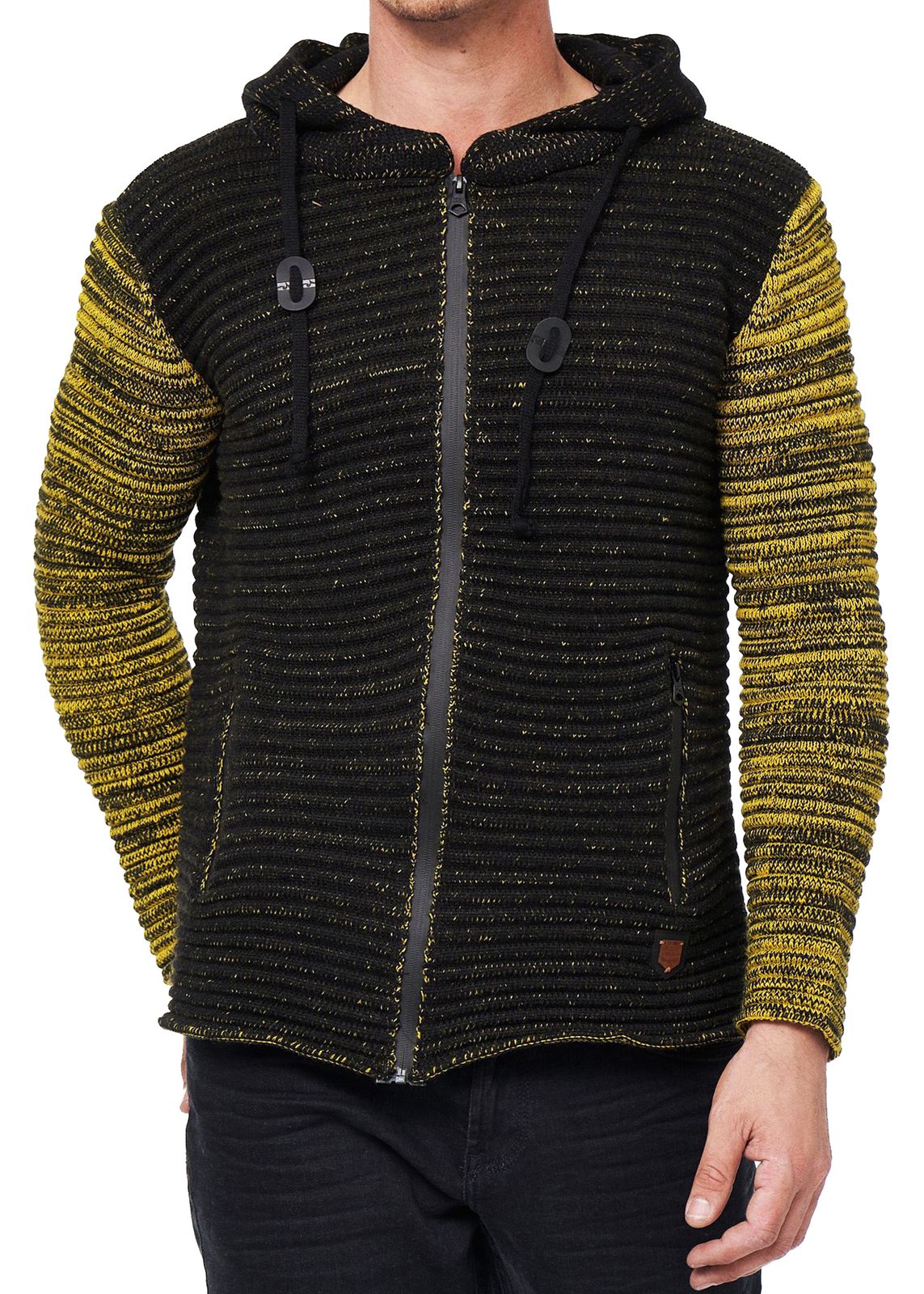Schwere Herren Grobstrick-Jacke mit Kapuze und Zipper Biker Sweat-Jacke 13408 Schwarz/Gelb