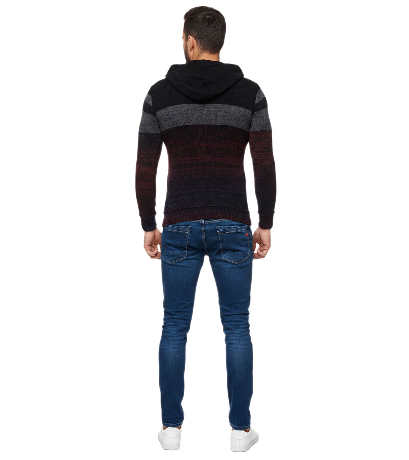 Sportlicher Herren Strick Kapuzen-Pullover im Colorblock Design Sweater mit Kängurutasche Hoodie 13311 Weinrot/Schwarz