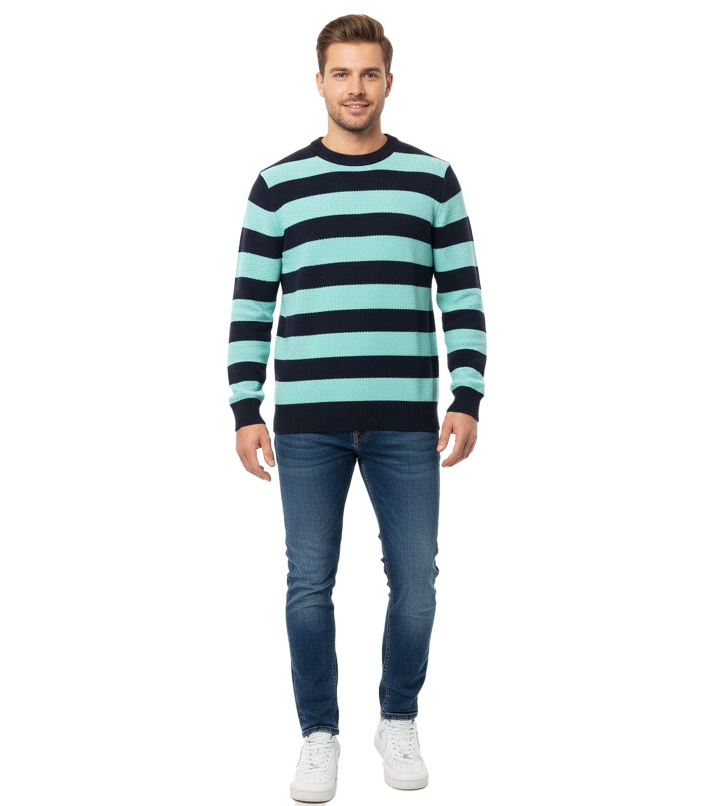 Stylischer ESPRIT Herren Strick-Pullover im Streifen-Design Rundhals-Sweater Baumwoll-Pullover Dunkelblau/Türkis