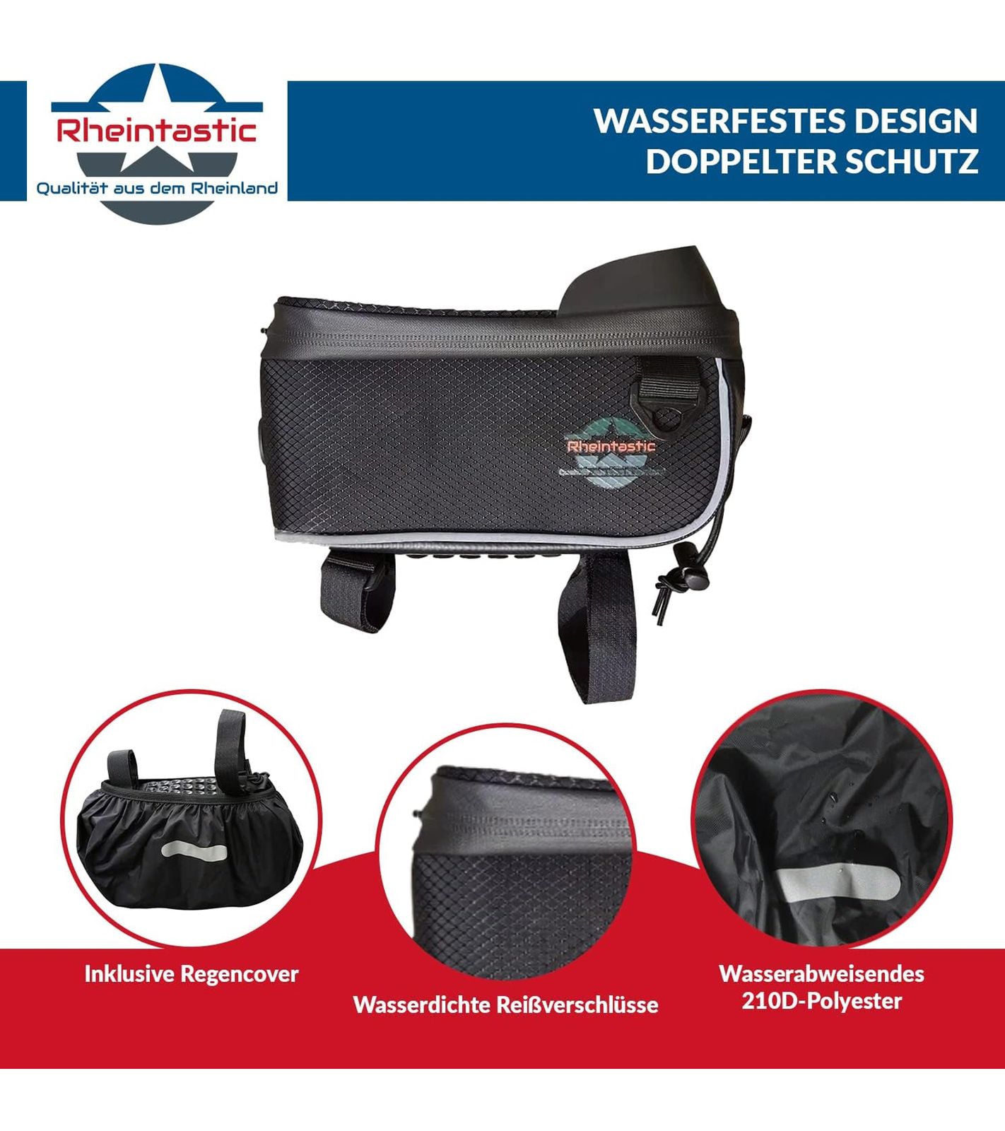 - Fahren bei Regen? Kein Problem mit der Rheintastic-Oberrohrtasche! Das zu 100 % wasserdichte 210D-Polyester & die laminierten Reißverschlüsse schützen Handy & Wertsachen für Nässe
