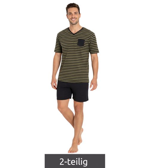 weicher Herren Pyjama 2-teiliger Shorty-Set mit Brusttasche und Streifen kurzer Schlafanzug Baumwoll-Pyjama 957908 Schwarz/Oliv