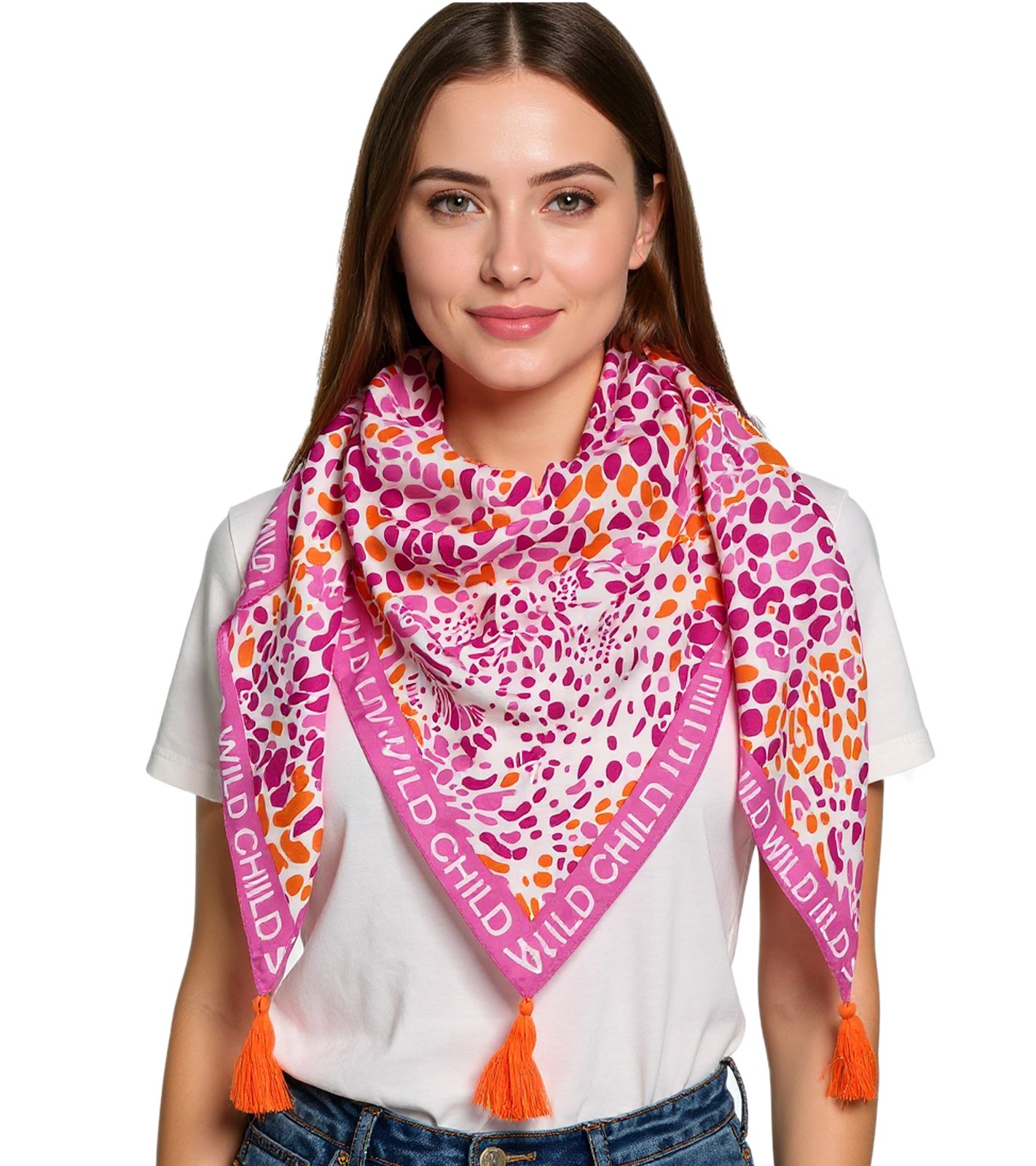 ZWILLINGSHERZ Leo Kopf Dreiecks-Tuch mit Animal-Print und Wild Child Schriftzug Mode-Tuch 3014D-0107-13 Pink/Orange